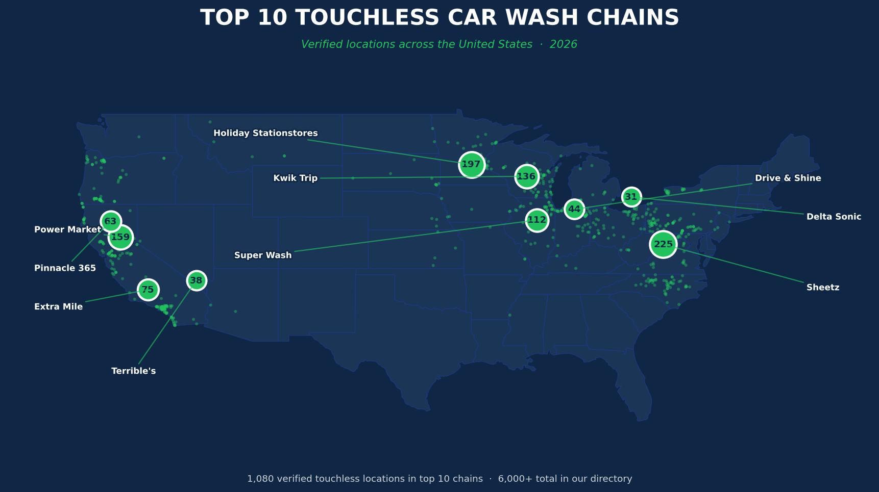 So we built this list differently. We track over 6,000 verified touchless car wash locations across all 50 states and cross-reference them against chain operators, individual store pages, customer reviews, and equipment manufacturers. What follows is the only data-driven ranking of the 10 largest dedicated touchless car wash chains in the United States — sorted by verified touchless location count, with average customer ratings, states served, and the actual equipment each chain uses.
